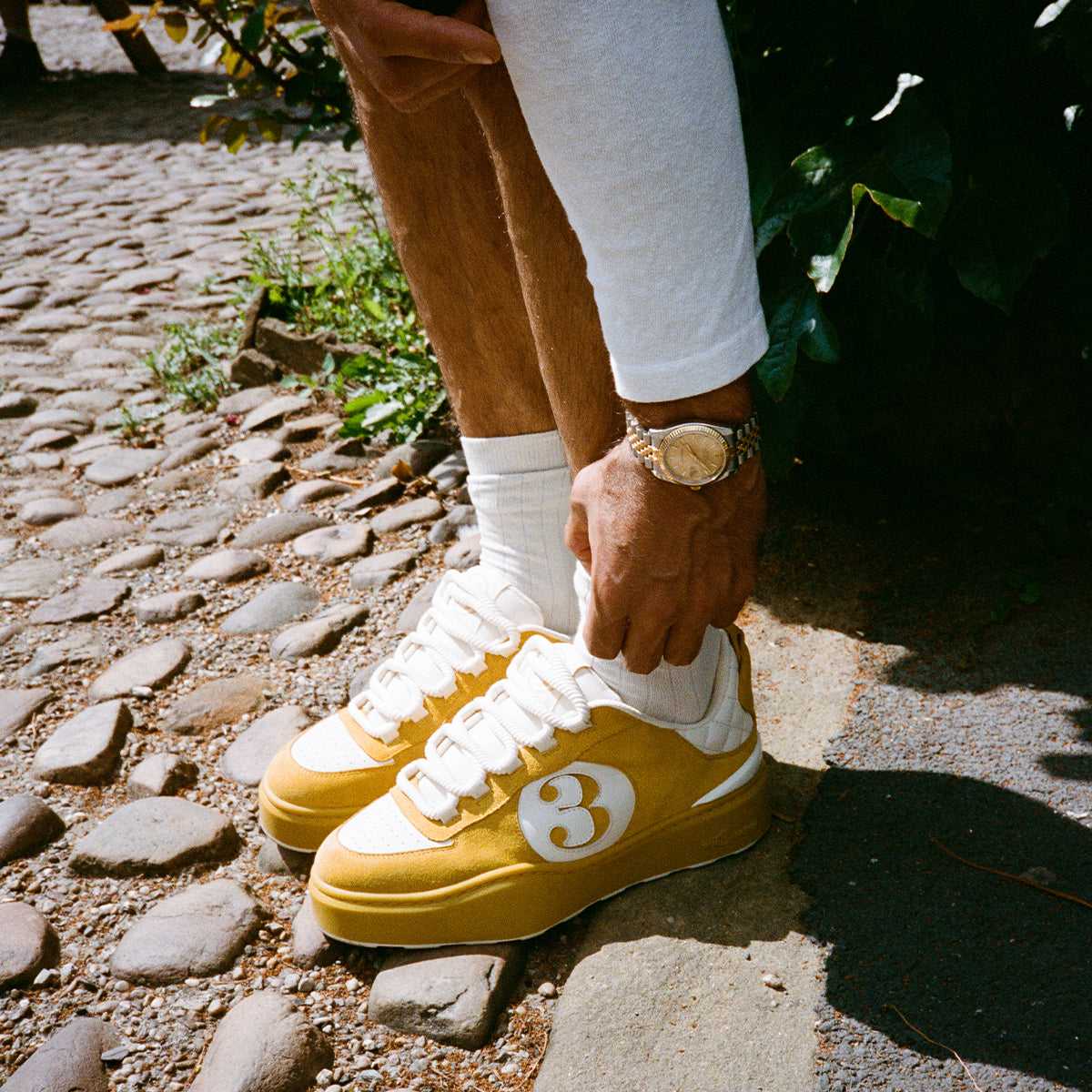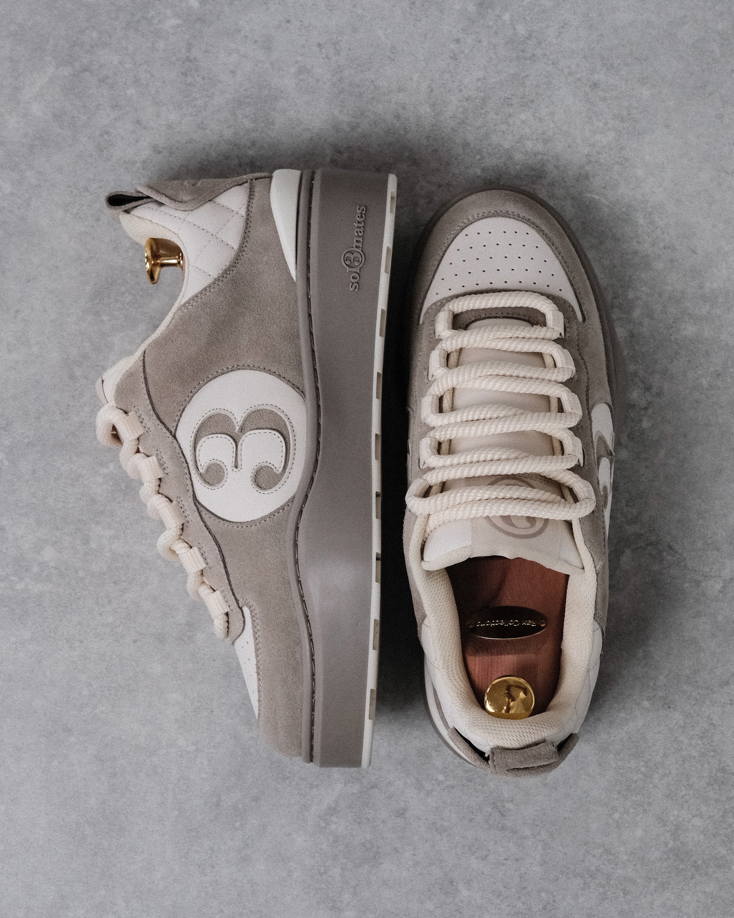 Sun-baked suede wrapped over crisp white leather. Effortless confidence with just the right edge.